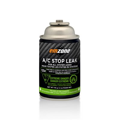 emzone 12a A/C Stop Leak seals leaks permanently in metal and rubber parts, including evaporators, condensers, driers, O-rings, and gasket joints. It also improves system efficiency and prevents future leaks. The emzone 12a A/C Stop Leak is safe for all systems and will not clog or restrict flow. The 114 g can contains sufficient stop leak to stop minor leaks in 2 lb. to 5 lb. A/C systems.